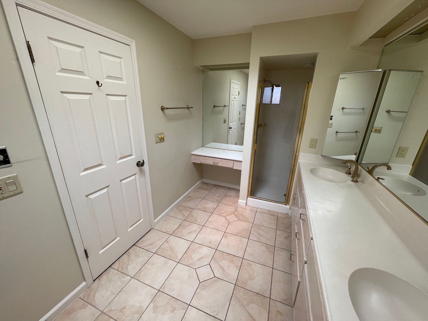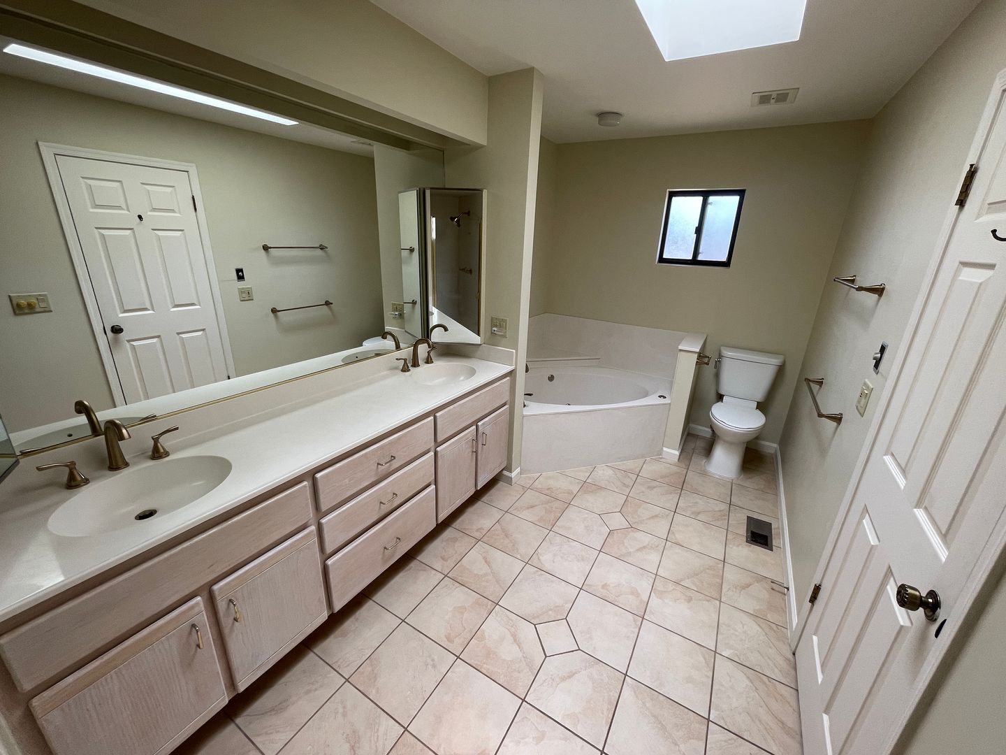 MASTER BATHROOM HAS TILE FLOORING, LARGE JETTED TUB, WALK IN SHOWER, DOUBLE SINK VANITY, WITH ADDITIONAL VANITY AREA AND A SKYLIGHT FOR PLENTY OF NATURAL LIGHT.