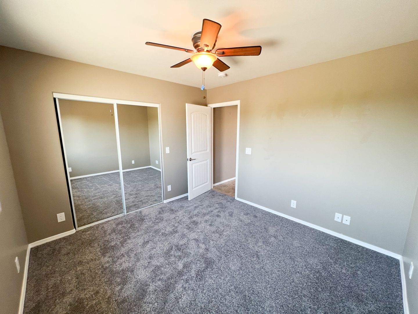 The property has nice window coverings and security screen doors on all exterior doors. A long driveway and double garage provide easy parking. The bedrooms feature carpet, while the living room, dining area, and bathrooms have tile floors. Ceiling fans are installed in all rooms, and the main bedroom closet comes with designer built-in shelves.