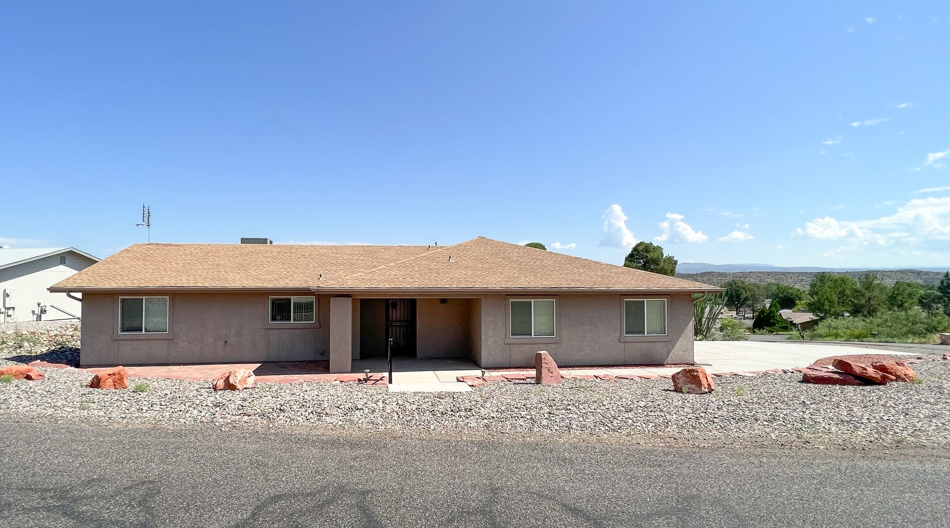 This single-level modern home features an elevated deck with stunning views of Mingus Mountain and Sedona red rocks. Situated on a corner lot, the property offers many upgrades throughout and a spacious layout with a beautiful neutral color scheme. The home includes a wood front door, granite countertops, stainless steel appliances, cherry wood cabinets, and a gas stove. Additional amenities include an sink R/O system, house water softener, full size washer, and dryer.