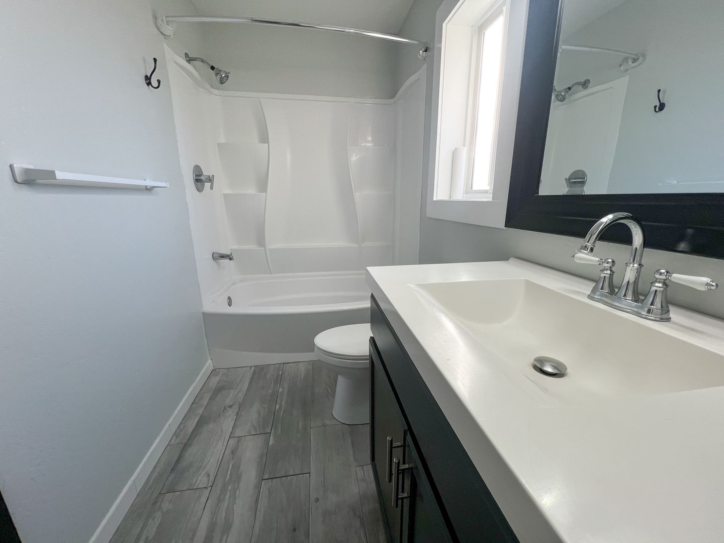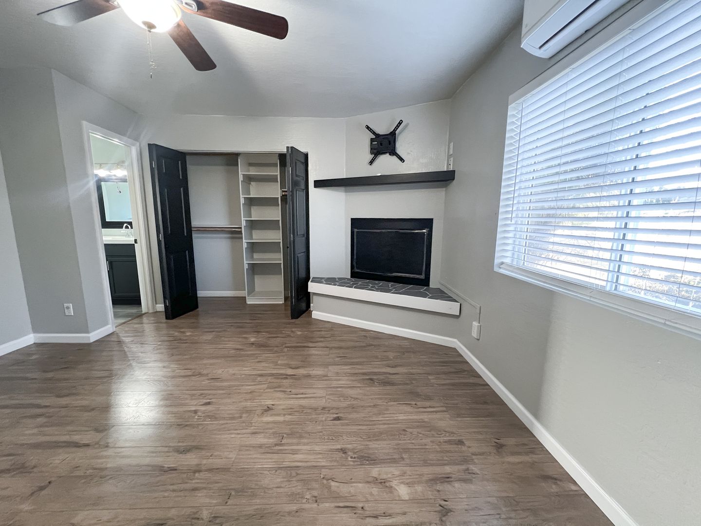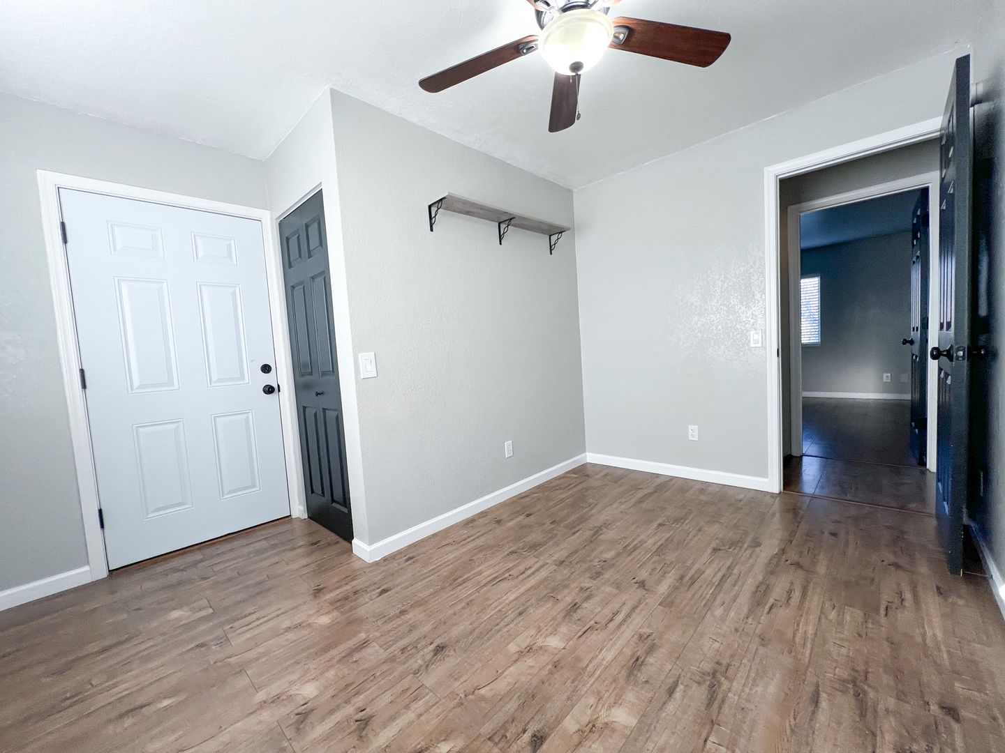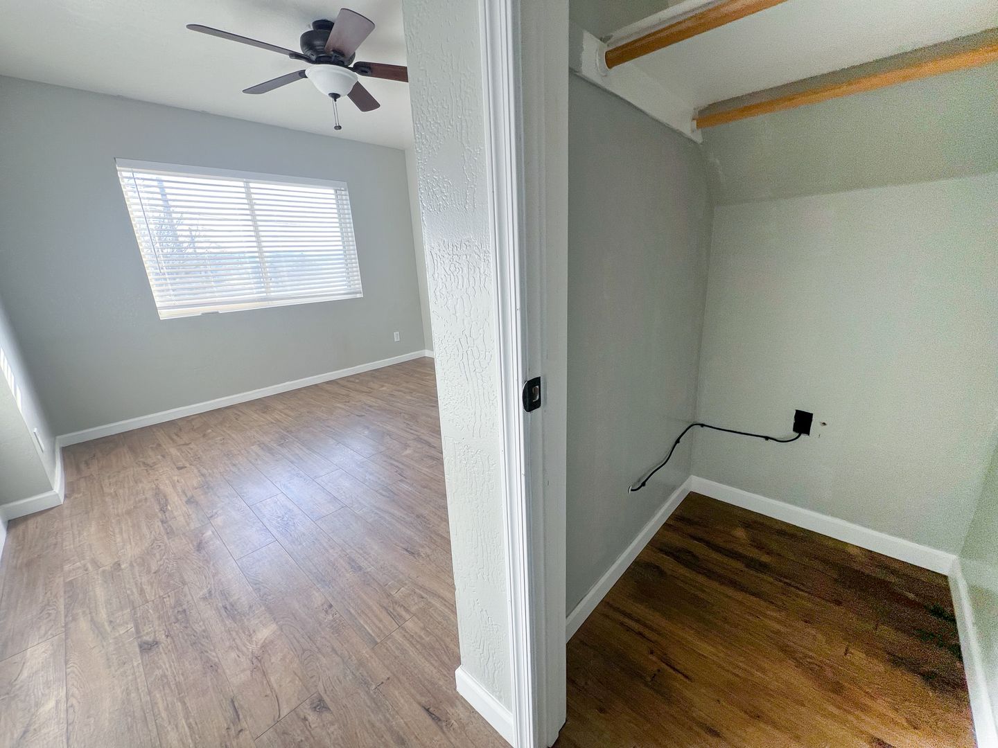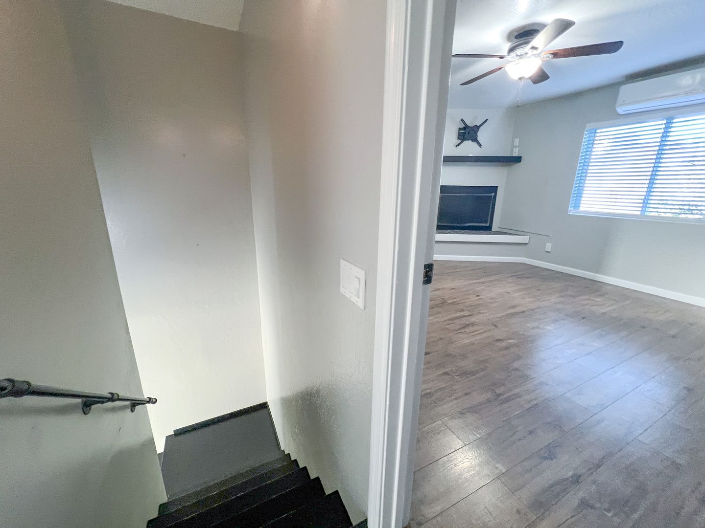 Two-story 2-bedroom, 1-bathroom home with modern fixtures and plank flooring throughout. The first floor features a kitchen and living room with under-stairs storage, while the second floor includes a master bedroom with the one ensuite bathroom and a second bedroom with balcony access. Cooling and heating wall units, along with ceiling fans in all main rooms. The side yard offers privacy with bamboo, a picnic table, and a raised plant bed, and there is partial fencing. Additional features washer/dryer hookups only in the kitchen closet. Extra storage in a shed located in the parking area. Tenant(s) responsibility for water, electric, and trash. Pets are negotiable. (Approximately 825 sqft)